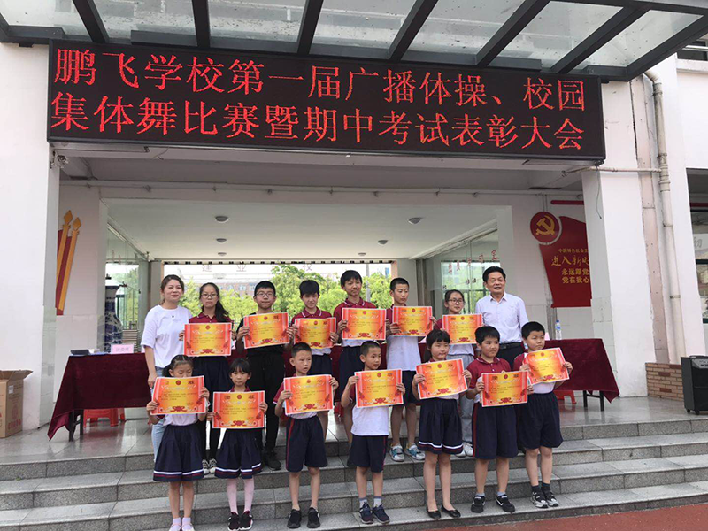 为丰富校园文化生活,增强学生体质。培养学生集体荣誉感,鹏飞学校于5月12日成功举行了“广播体操”、“校园集体舞”比赛。此次比赛共有10个代表队参加,分成1-3年级、4-6年级和七、八年级三个组。七位评委进行现场打分,主要从进场、服装、教师领操、精神面貌、动作质量、退场等方面进行评价,去掉一个最高分,一个最低分,最终角逐出三1班92.5分、六2班92.63分、七1班93.13分,分别获得1-3年级组、4-6年级组和七、八年级组第一名。