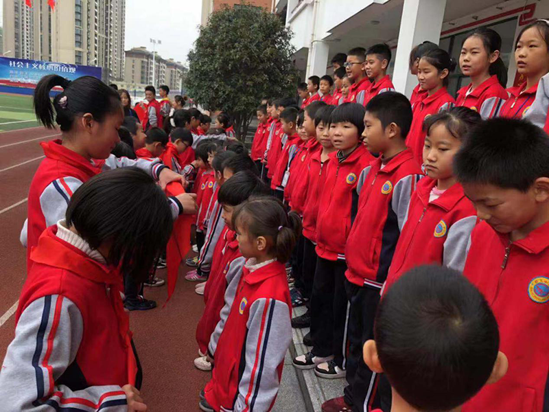 校团支部副书记少先大队辅导员徐程程宣读49名新队员名单。在欢快的乐曲声中,老队员为新队员戴上鲜艳的红领巾,随后新老队员互敬队礼。