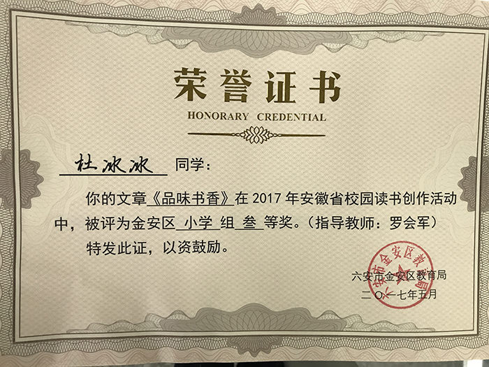 鹏飞学校荣获荣誉证书