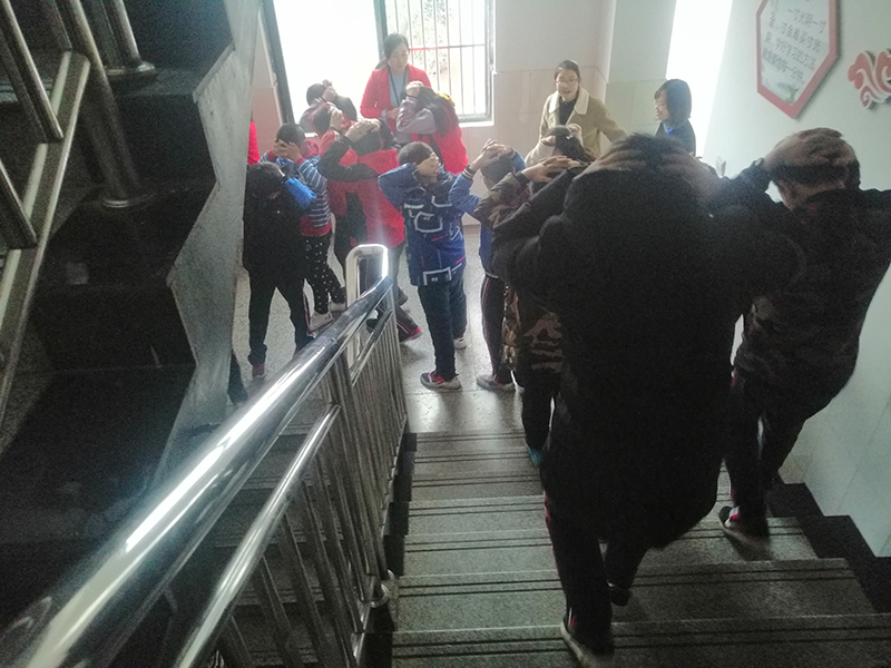 上午9:40,呜——呜——,随着警报长鸣,相关领导立即到达指定岗位,引导教室内学生快速疏散。班主任及科任教师组织学生弯着腰、用双手护着头,沿着学校指定道路快速前进。在负责楼梯口疏导的老师坚守在自己工作岗位上,直到最后一名学生通过,才迅速撤离。整个过程紧张有序,全校400多名师生在预定的时间内安全撤离教学楼,到达指定区域。疏散到操场的学生在班主任老师的带领下清点人数,师生全部到达指定安全位置。