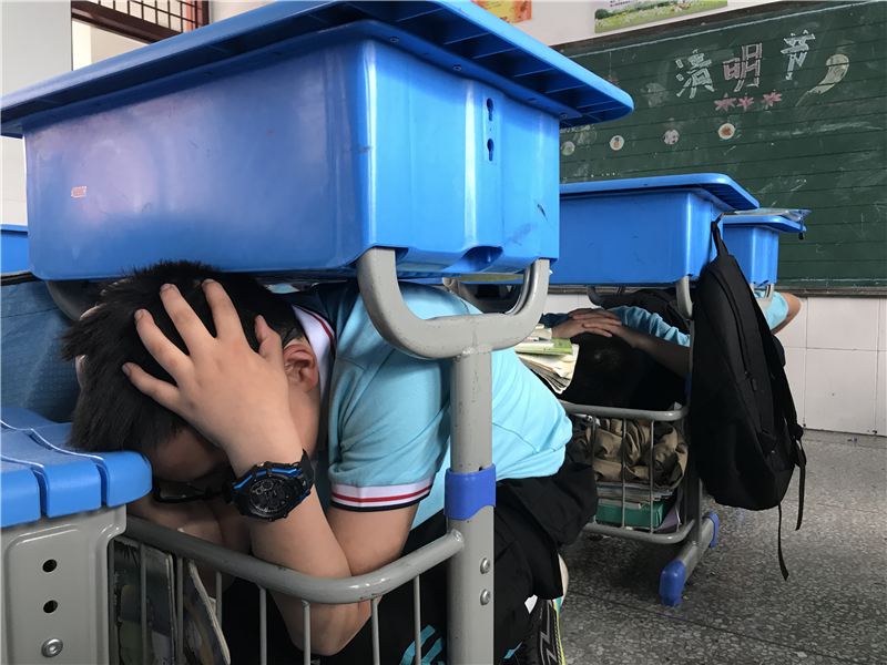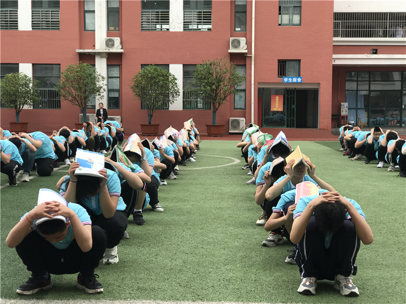 2021年5月12日上午9点30分,六安市鹏飞学校的校园广播里,传来凄厉刺声的警报声,教学楼里的所有中小学生,立即在班级里进行避震演练。几分钟后,在教师的带领下,紧急有序地双手抱头,分东西两个楼道向楼下疏散,迅速撤离到教学楼前的操场上集结,进行逃生演练。