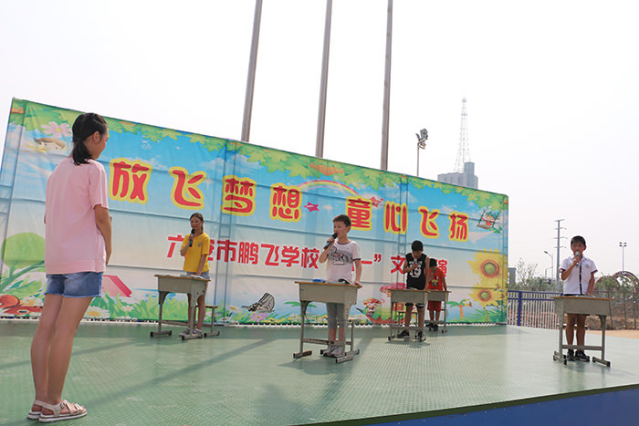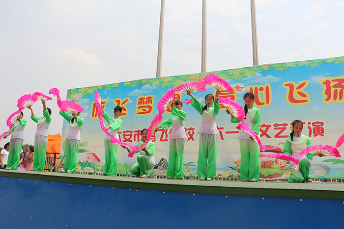 “六一”是一支歌,跳跃着美妙的音符;“六一”是一首诗,充满着幻想和憧憬;“六一”是欢乐的海洋,是孩子们的节日。2017年6月1日上午9点,在舞蹈《中国梦》的动感旋律中拉开了六安市鹏飞学校“六一”文艺演出的序幕。尽管天气特别炎热,老师们、家长们、孩子们的热情却丝毫未受到影响。接下来一个多小时的时间里,六安市鹏飞学校的运动场变成了欢乐的海洋,孩子们纷纷登台表演,展风采、献才艺,把她们充满憧憬的瑰丽梦想、雏鹰展翅的艺术风采和蓬勃向上的精神风貌尽情展现在舞台上。