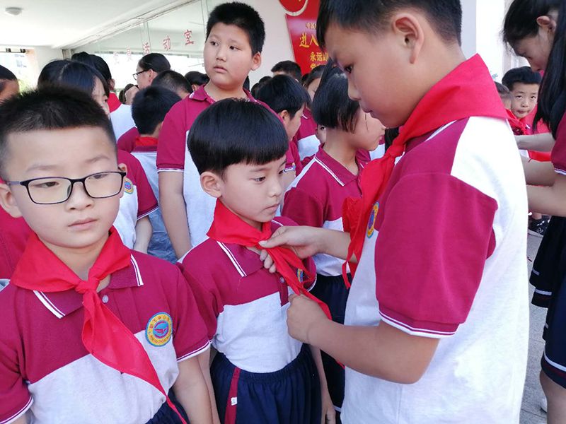 5月23日我校举行了隆重的少先队入队仪式。仪式由大队辅导员徐程程主持。仪式在激昂的《中国少年先锋队队歌》中拉开帷幕,全场学生齐唱《少年先锋队队歌》,歌声嘹亮,振奋人心。辅导员宣布了100名新队员名单。在歌声中老队员们给新队员戴上了鲜艳红领巾并互敬队礼。
