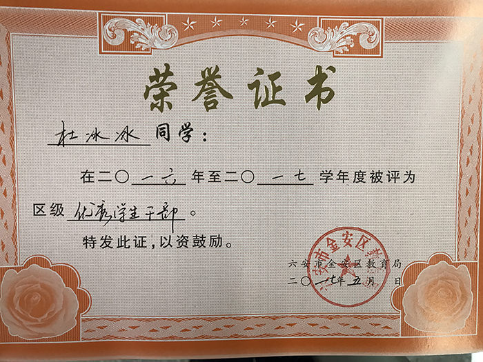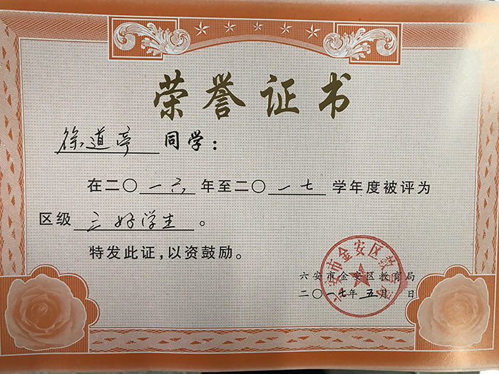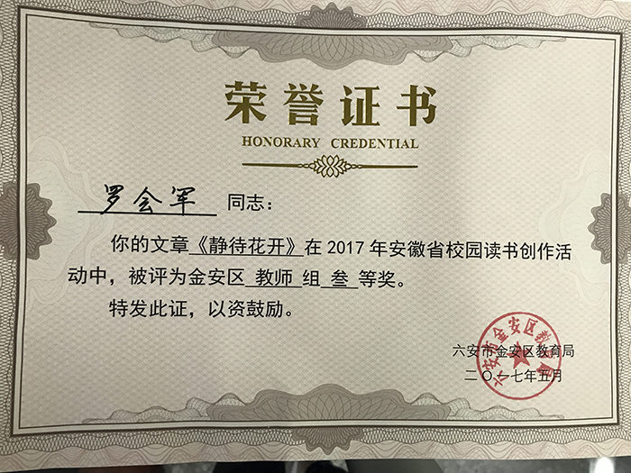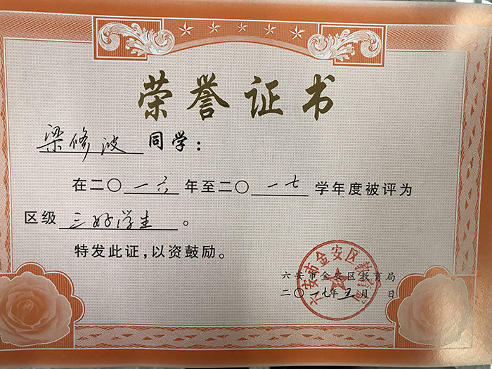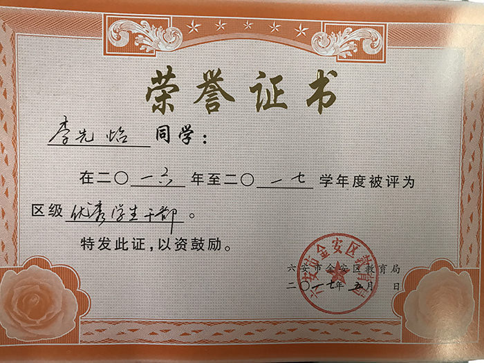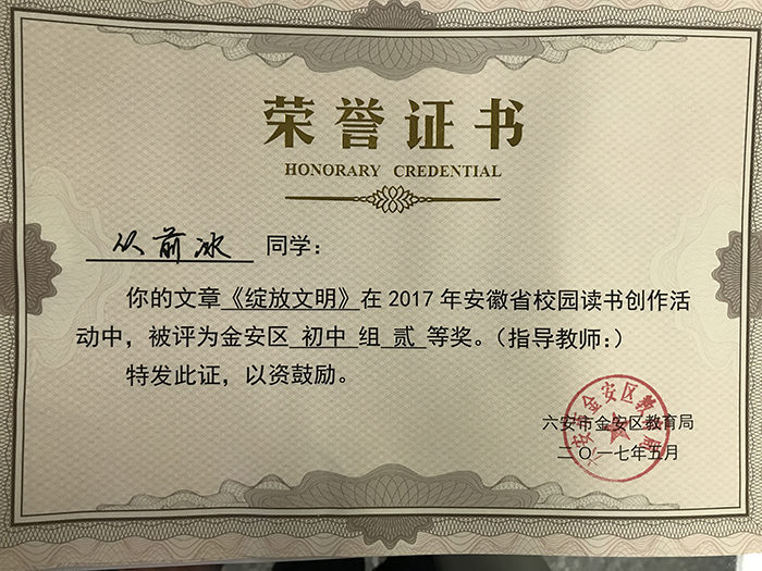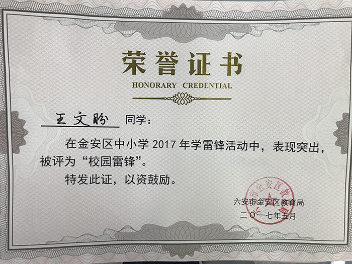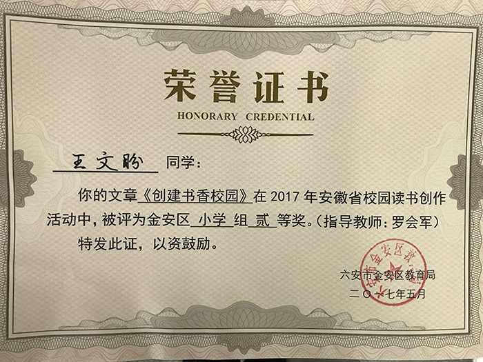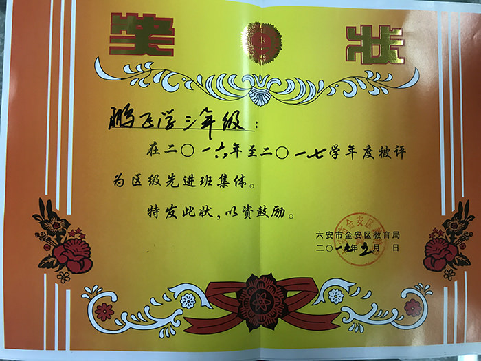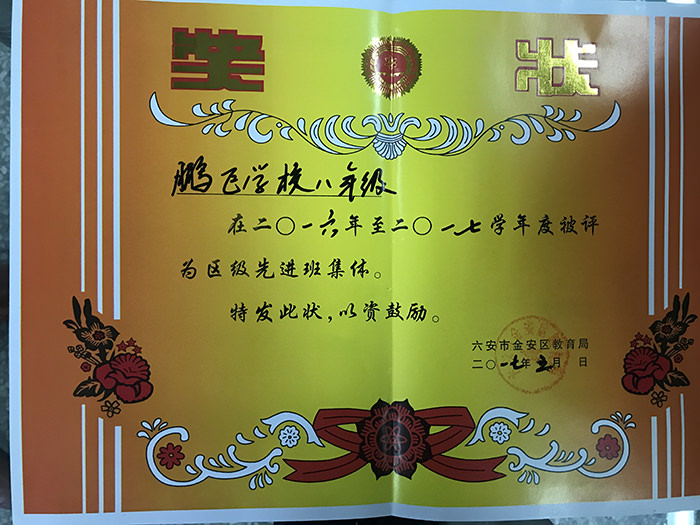 鹏飞学校荣获荣誉证书