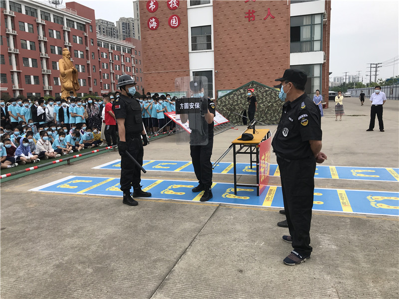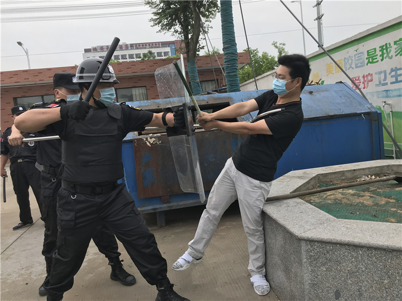 演练前,由各班主任向学生宣传本次演练的重要意义,讲明演练的程序,内容和纪律要求。由专业人员向师生展示,胶木警棍,钢叉、防刺背心、防割手套、盾牌、防暴帽等防护器具。
