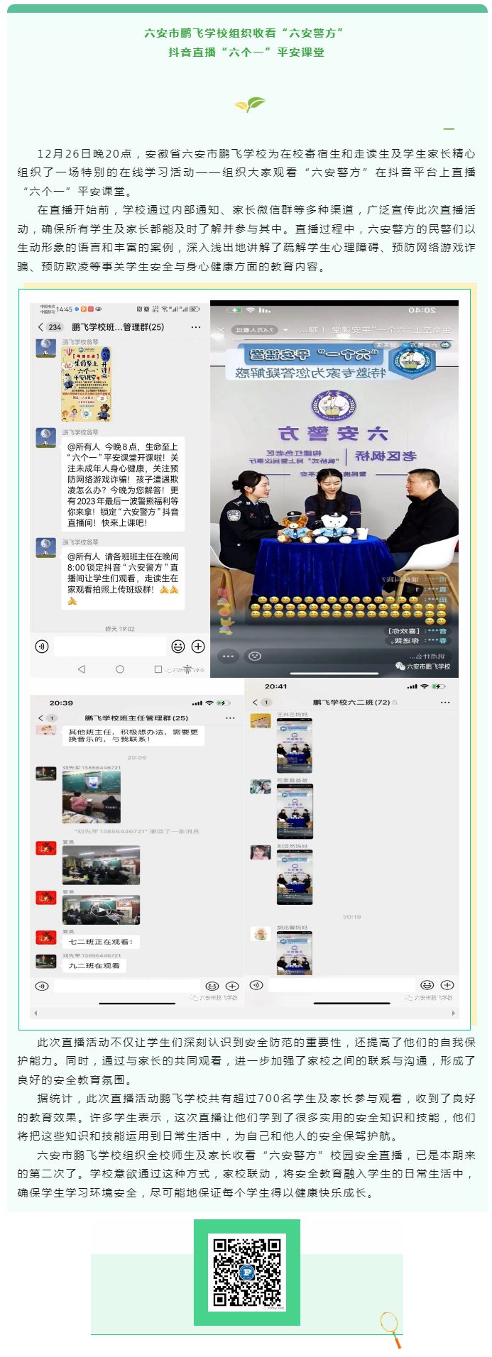 六安市鹏飞学校组织收看“六安警方”抖音直播“六个一”平安课堂